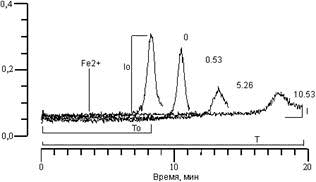 Для того, чтобы изучить конкретный механизм действия арбидола на процесс ПОЛ, нами было исследовано его влияние на ХЛ, сопровождающую окисление трис-буферной суспензии фосфолипидных (ФЛ) липосом (ЛС), индуцированное ионами двухвалентного железа [14]. Кинетика ХЛ в данной системе разделена на четко выраженные стадии: быстрая вспышка ХЛ, латентный период и медленная вспышка ХЛ. Применение трис-буфера позволяет хорошо отличить медленную вспышку ХЛ, которая непосредственно отражает окисление в липидной фазе мембран, от стационарного свечения в водной фазе, наблюдающегося при окислении в фосфатном буфере [13]. Кроме того, по изменению латентного периода можно судить о влиянии исследуемого вещества на концентрацию ионов железа.