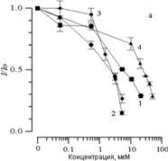 Влияние арбидола (1), СП 224 (2), СП 226 (3) и СП 234 (4) на изменение амплитуды (а) и латентного периода (б) ХЛ, сопровождающей Fe2+-индуцированное окисление суспензии фосфолипидных ЛС. По оси абсцисс - концентрация добавленного вещества (мкМ). По оси ординат - изменение параметров ХЛ (отн. ед.). Состав реакционной среды, как на рис. 1.