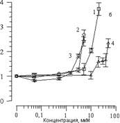 Добавление к суспензии различных концентраций СП-224, СП-226 и СП-234 приводило к аналогичным изменениям кинетики ХЛ. На рис. 2 , а показано влияние арбидола и его структурных аналогов на изменение амплитуды ХЛ (I/Io). Видно, что с увеличением концентрации всех веществ происходит уменьшение амплитуды ХЛ. Концентрация 50%-го ингибирования амплитуды ХЛ (С50%) может в данном случае служить мерой способности данного соединения тормозить процесс ПОЛ. На рис. 2, б показано влияние вышеперечисленных веществ на изменение латентного периода ХЛ. Видно, что с увеличением концентрации этих веществ происходит увеличение латентного периода ХЛ. Как было показано ранее [14], при добавлении различных соединений к суспензии липосом латентный период ХЛ может уменьшаться, либо оставаться без изменения или увеличиваться. Уменьшение латентного периода ХЛ происходит при комплексировании исследуемого вещества с ионами Fe2+, которые при этом выпадают из реакций цепного окисления в липидной фазе. В случае арбидола и его аналогов происходит увеличение латентного периода ХЛ, поэтому ингибирование процесса ПОЛ происходит не за счет взаимодействия с ионами железа.